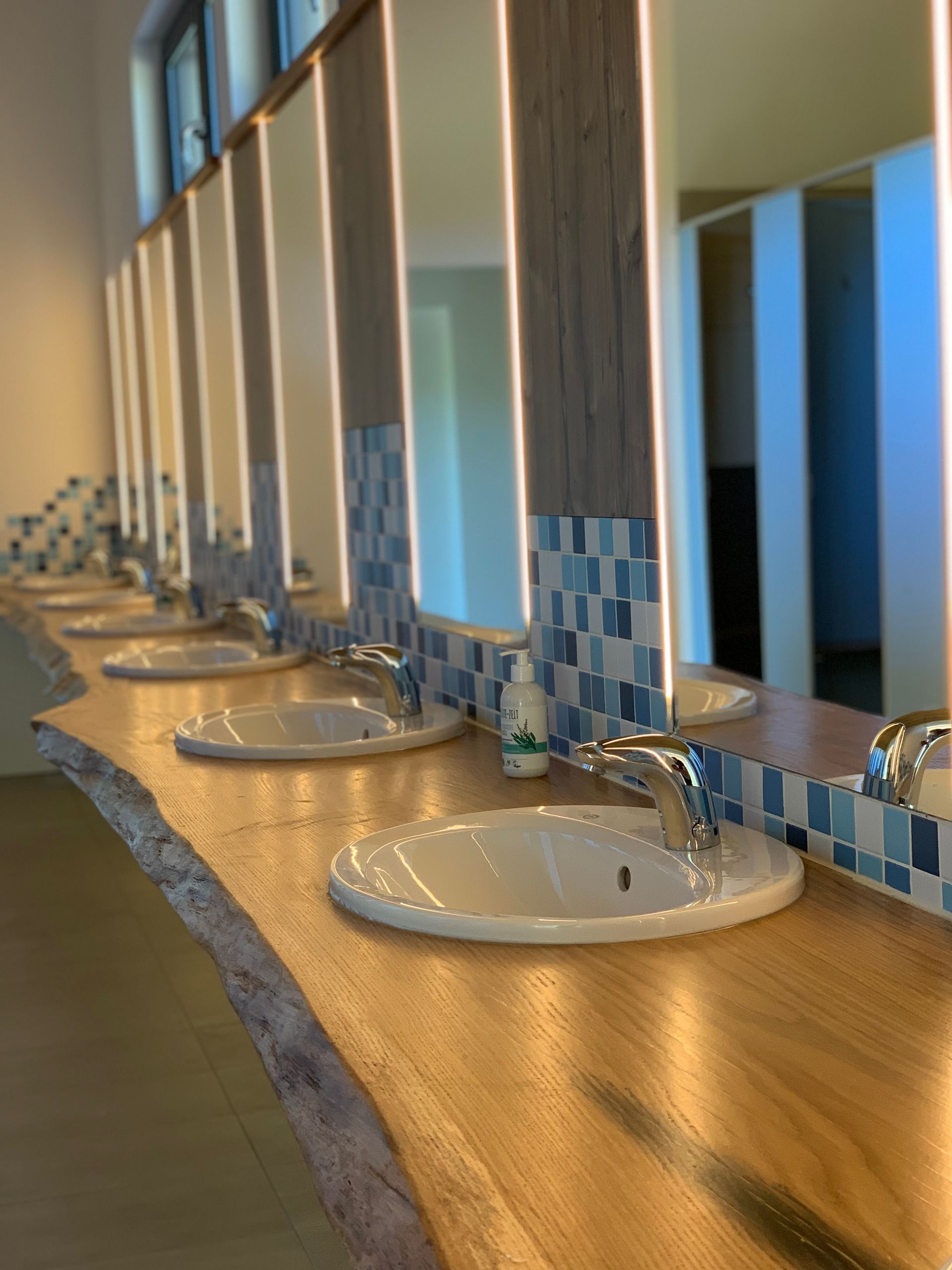 Gewünscht wurde eine Lösung für Haartrockner und ein Wickelplatz, also lieferten wir einen in eine Nische passenden Unterschrank mit massiven Objektschlössern, abgedeckt mit einer massiven 50mm Eichenplatte. Darüber Installierten wir eine klappbare Wickelplatte sowie 2 Haartrockner mit Abschaltautomatik. Abgerundet wird die Nische durch Spiegel mit LED Beleuchtung, eingefasst mit Mosaikfliesen in 20x20cm.